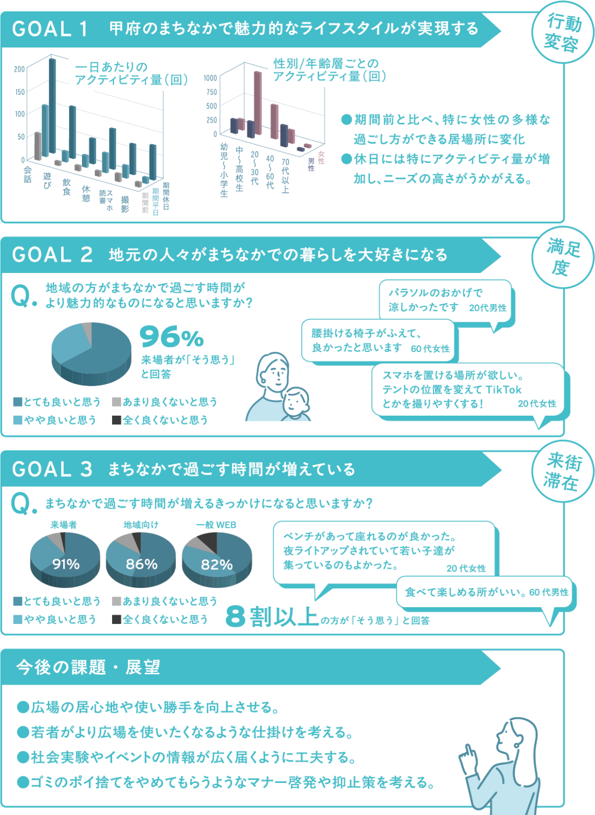 来場者の99%が社会実験でつくった場に満足した。また、甲府城への眺めを大切にしつつ、居心地よく滞在できる広場があることが、甲府城への愛着を深めていくきっかけになると感じた方が約9割もいた。