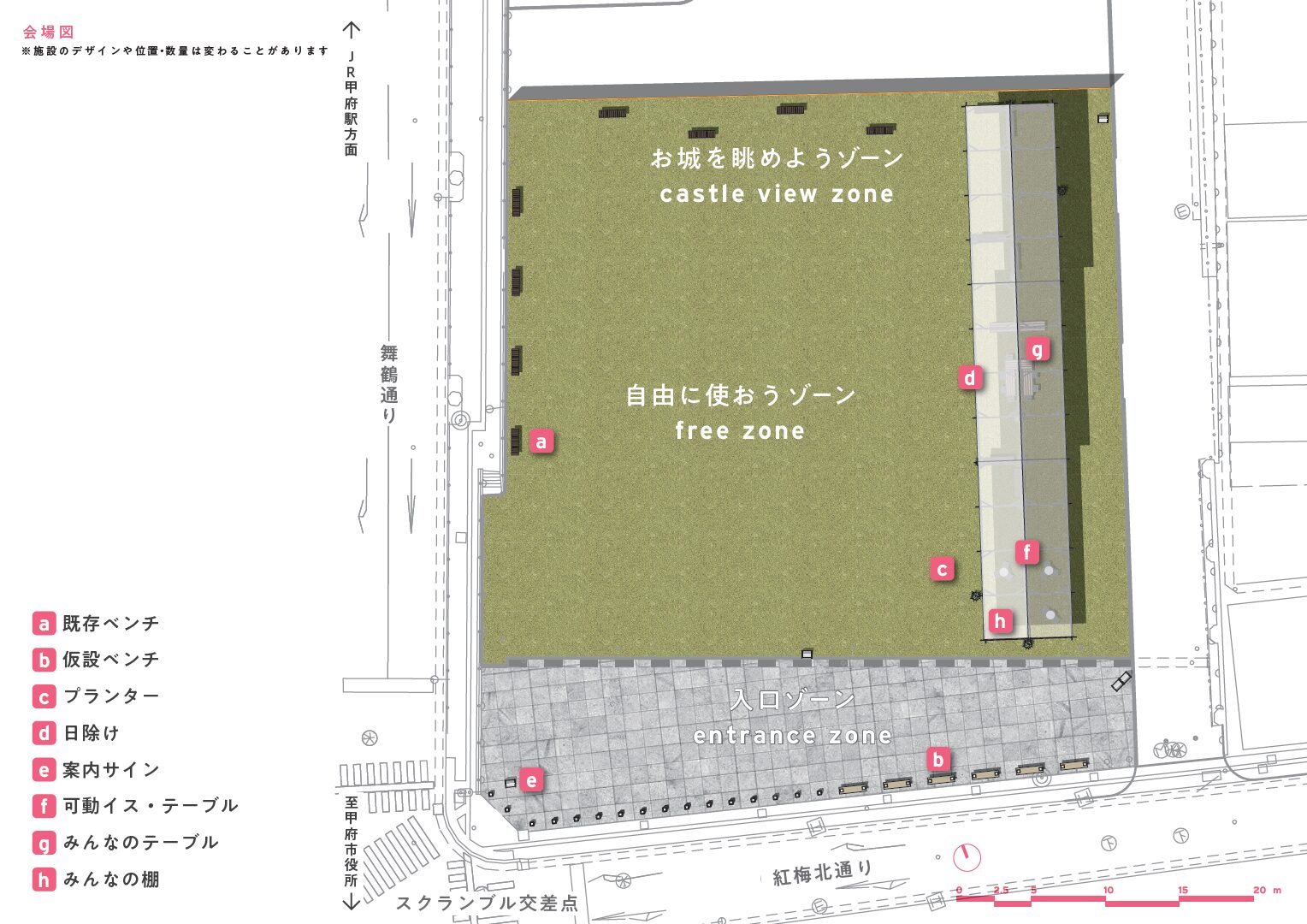 舞鶴城公園南広場は、甲府駅と南側の商業地の中間に位置しており、近隣には市内有数の子ども屋内遊び場「おしろらんど」や商店街・再開発ビルなどの商業集積、また県庁や市役所があるなど、多様な人の流れをつなぐ場所として大きな可能性を秘めています。また甲府城という一級品の文化財の中に位置しており、甲府城を眺める視点場でもあります。